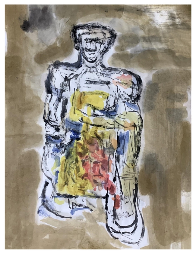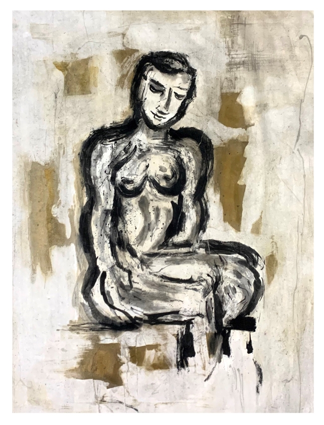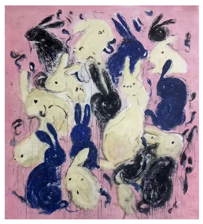 本次甘遂展出的作品包含《坐姿人物》《马》《群兔》等系列,延续其“松弛感”创作内核的同时,更以表现性手法放大生命状态的张力。《坐姿人物》以黑灰笔触勾勒躯体轮廓,留白与晕染间透出松弛的肢体情绪,仿佛将都市人疲惫却又渴望放松的状态展现得淋漓尽致;《马》用纯水墨表现,既显画面的张力,又藏着墨色变化的“饱和感”,让人感受到一种自由奔放的生命力;而《群兔》系列则以黑黄对比色铺陈,灵动的线条让动物形象既稚拙又鲜活,暗合都市人“在喧嚣中寻松弛”的心理状态,如同在繁忙的都市生活中寻找那一丝难得的童真与惬意。