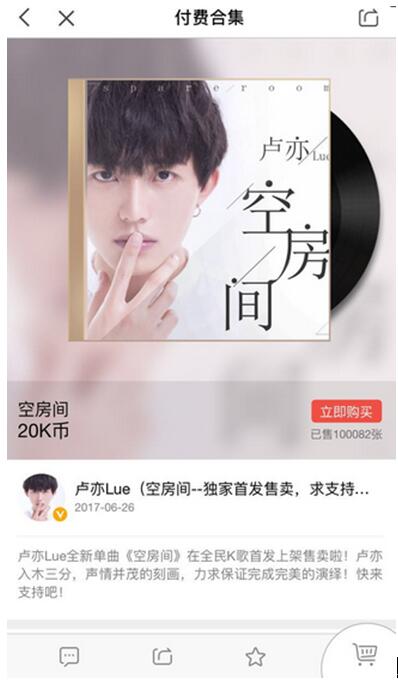 事实上,《空房间》已经不是卢亦第一次创造惊喜了。去年12月,通过全民K歌直播“出道”不到半年的卢亦就带着首张单曲《丢下我一人》创下了超高点击率。而基于全民K歌4亿用户群的粉丝经济力量,卢亦通过一场场精心策划的直播内容,更快速实现了传统歌手可能要蛰伏三到五年的粉丝初步积累,他的日均浏览量可高达10万级观众,成为全民K歌当仁不让的人气王。随着此次付费单曲的大获成功,卢亦在24小时内向音乐新势力的华丽转变,也证明了全民K歌的造星实力不容小觑。